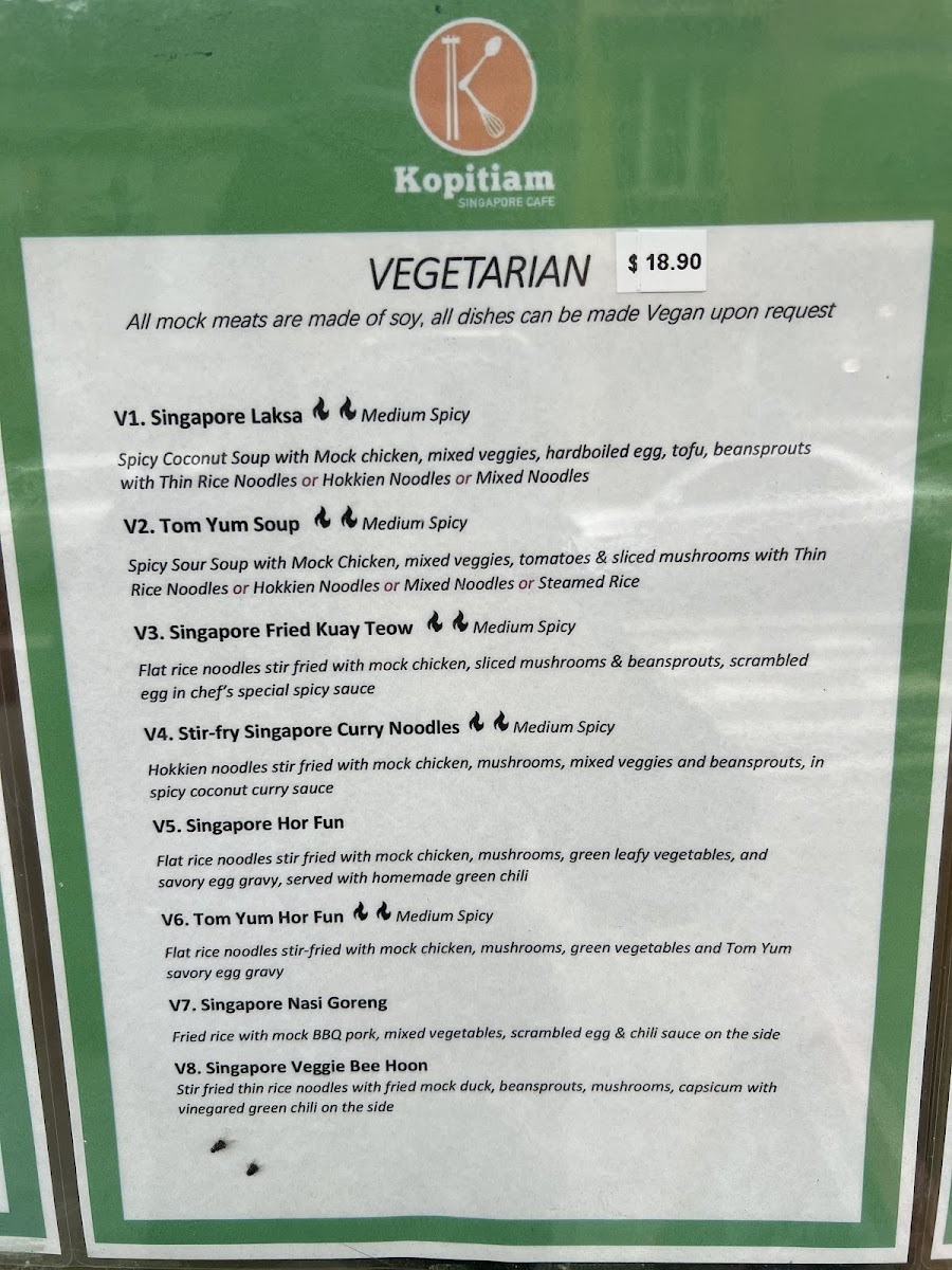 Vegetarian. Mock chicken[soy],mixed veggies,Hard Boiled egg, tofu puffs, beansprouts with vermicelli noodles or Hokkien noodles or mixed noodles in coconut based laksa soup.